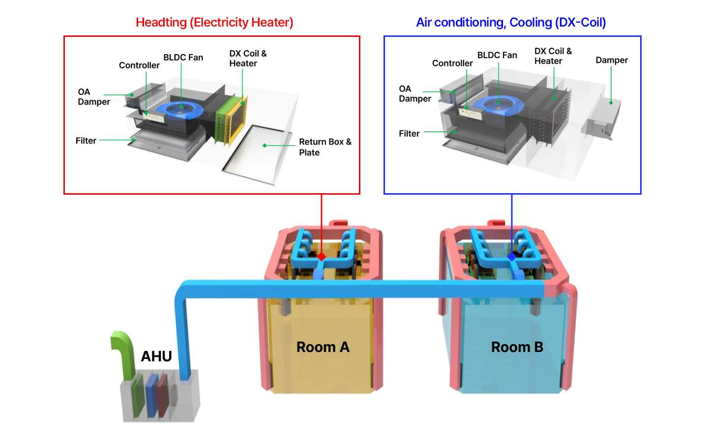 A device that enables individual heating/cooling control for each room within the same air-conditioning zoning, while supplying clean air through filteration.